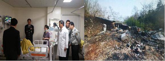 ▲(좌)안병갑 서장과 직원들이 할머니를 병문안하고 위문금을 전달했다.(우)전소된 김할머니의 주택.