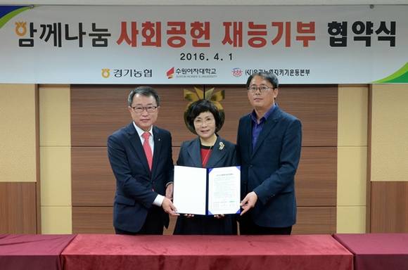 경기농협지역본부(본부장 한기열)와 수원여자대학교(총장 엄태식), 우리농업지키기운동본부 경기본부(본부장 송명규)는 지난 1일 경기농협 제1중회의실에서 경기도 농업인과 소외계층의 복지 및 삶의 질 향상을 위한 함께나눔 사회공헌 재능기부 협약식을 체결했다.