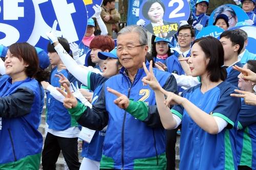 ▲호남 선거지원에 나선 더불어민주당 김종인 대표가 2일 오후 광주 남구 구동 광주공원을 찾아 이병훈(동남을) 후보의 선거운동원과 함께 율동을 하고 있다. (광주=연합뉴스)