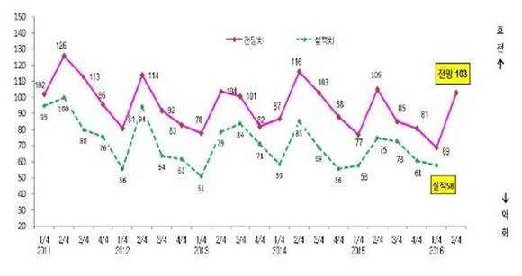 자동차 ․ 운수장비 108 (1분기 74) : 1분기 명절로 인한 조업일수 감소가 2분기 조업일수 증가 및 특근으로 이어져 생산량이 증가할 것으로 나타났고, 지난해 말로 끝난 자동차 개별소비세가 6개월 연장되면서 재인하 효과가 판매증가로 이어져 호조 흐름을 이어갈 것으로 전망했다.