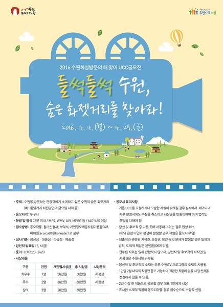 수원시가 오는 29일까지 2016 수원화성 방문의 해를 맞아 수원의 숨은 화젯거리 발굴을 주제로 UCC공모전을 오는 개최한다.
