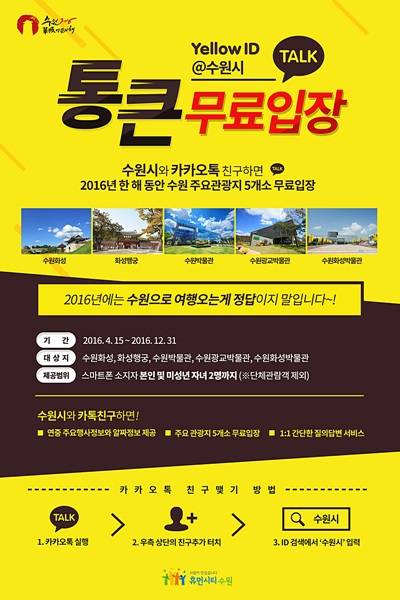 수원시가 2016 수원화성방문의 해를 맞아 올 한해동안 수원시와 카톡친구를 맺으면 오는 15일부터 주요 관광지 5개소에 대해 무료입장을 실시한다.