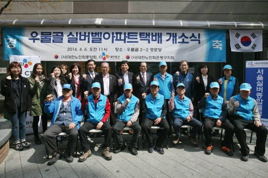 6일 CJ대한통운은 서울시 은평구 은평뉴타운 우물골2단지 아파트에서 대한노인회중앙회와 실버택배 사업을 위한 ‘우물골실버벨 아파트택배’ 개소식을 가졌다고 밝혔다.