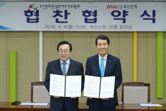 부산은행은 4일 오후 부산시청에서 부산문화관광축제조직위원회(위원장 서병수 부산시장)가 주관하는 부산불꽃축제, 부산바다축제, 부산록페스티벌, 부산항축제, 부산해맞이축제, 부산낙동강유채꽃축제 등 6개 행사에 연간 총 3억7천만 원을 후원하는 협약식을 가졌다.