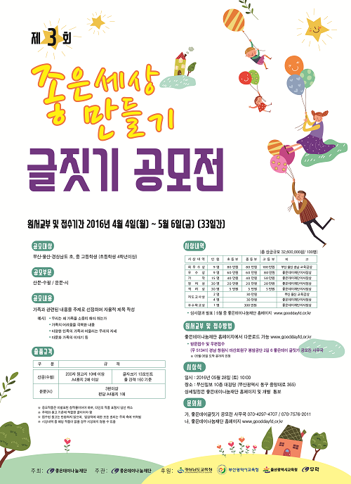 좋은데이나눔재단(이사장 최재호)은 자라나는 청소년들에게 가족의 사랑과 소중함에 대한 제3회 좋은세상 만들기 글짓기 공모전을 개최한다.