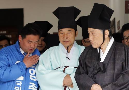 ▲더불어민주당 손학규 전 상임고문(가운데)이 7일 오전 경기도 남양주에서 열린 다산 정약용 선생 180주기 묘제에 처음 술잔을 올리는 초헌관으로 참석, 묘소로 이동하고 있다. 왼쪽은 손 전고문의 측근으로 경기 광주에 출마한 더불어민주당 임종순 후보. (사진=연합뉴스)