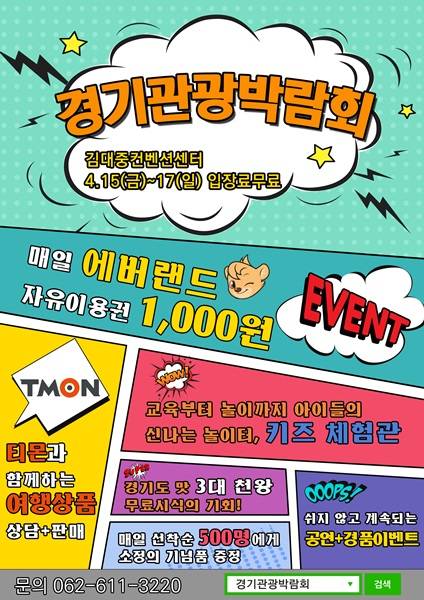 경기관광공사 관계자는 “에버랜드 1000원 이벤트, 드라마 태양의 후예 체험관, 여행상품 파격할인 등 놓쳐선 안 될 풍성한 프로그램을 준비했다”고 밝혔다.