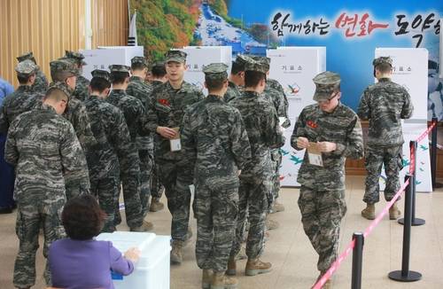 ▲8일 오전 포항시 오천읍사무소에 마련된 사전투표소에서 해병대원들이 투표하고 있다.(포항=연합뉴스)