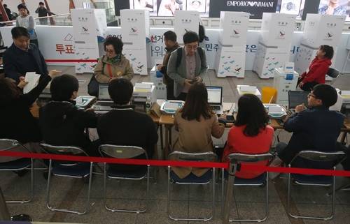 ▲4·13 총선 사전투표 첫째날인 8일 오전 서울 용산구 서울역 맞이방에 마련된 남영동 사전투표소에서 시민들이 투표에 참여하고 있다. 사전투표 기간은 8일과 9일 이틀간 오전 6시부터 오후 6시까지이다.(사진=연합뉴스)