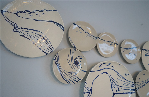 그 중에서 박진경 작가의 <Pakicetidae>라는 작품이 눈에 띈다. 'Pakicetidae'는 가장 오래된 고래화석으로 파키스탄의 초기 에오세(Eocene) 지층에서 발견된 약 5000만년 전에 생존했던 파키케투스류를 지칭하는 말이다. 박진경 작가가 아이슬란드를 방문했을 때 곳곳에서 볼 수 있는 고래화석을 보고 그것을 모티브로 도자 위에 그린 작품으로, 원형의 도자기는 무한으로 반복되는 파도이자 끝없이 펼쳐진 바다를 상징한다. 바다를 상징하는 도자 위를 유영하는 혹등고래 이미지를 통해 대양을 지배해 온 고래의 위상과 경이로운 자연의 아름다움을 표현하고자 하였다.