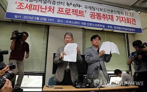 ▲국제탐사보도언론인협회(ICIJ)와 인터넷언론 뉴스타파가 2013년 5월 재벌가의 해외 페이퍼컴퍼니현황을 공개하고 있다. 국세청은 이들이 제기한 탈루·비자금 의혹에 대해 대대적인 세무조사를 실시했지만 대부분은 해외사업을 수행하기 위한 정상적인 특수목적회사로 밝혀졌다. (사진=연합뉴스)