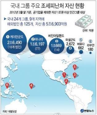 ▲2013년 5월 재벌닷컴이 공개한 국내대기업들의 조세피난처 자산현황. 대부분은 합법적인 페이퍼컴퍼니였으며, 국세청에 세금을 납부하고 있었다. (그래픽=연합뉴스)