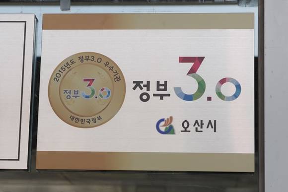 오산시가 행정자치부에서 주관하는 2015년 정부3.0 추진실적 평가에서 우수기관으로 선정돼 12일 시청사 중앙현관 앞에서 정부 3.0 우수기관 현판 제막식을 가졌다.