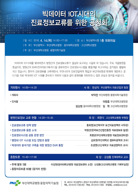 부산대병원(병원장 이창훈)이 오는 14일 오후 2시부터 부산시청 1층 대회의실에서 '빅데이터 IOT(사물인터넷)시대의 진료정보교류를 위한 공청회'를 개최한다.