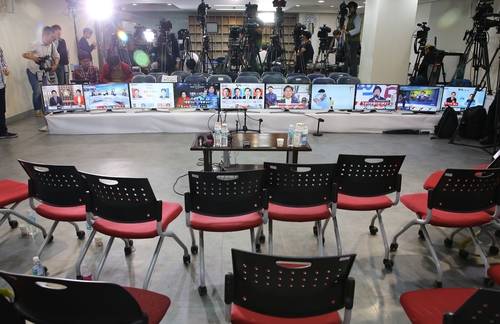 ▲13일 밤 서울 여의도 새누리 당사에 설치된 20대 국회의원선거 종합상황실이 모든 당직자가 빠져 나가 썰렁한 모습이다.(사진=연합뉴스)