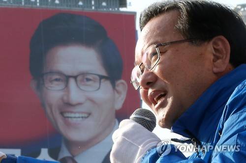 ▲대구에서 최초의 민주당계열 후보로 당선된 더불어민주당 김부겸 당선인(대구 수성갑)이 14일 대구 수성구 범어네거리에서 시민들에게 당선인사를 하고 있다. 김 당선인 뒤로 총선에서 맞붙었던 새누리당 김문수 후보 사진이 걸려 있다. (사진=연합뉴스)