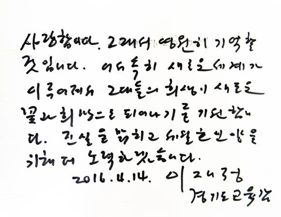 꽃잎이 되고 바람이 되고 저 하늘의 별이 된 사랑하는 250명의 아이들과 존경하는 11분의 선생님을 기억합니다.여러분의 꿈을 여러분의 사랑을 여러분이 남겨놓은 미래를 경기교육을 통해 함께 만들어 가겠습니다.