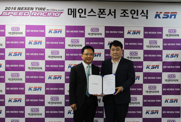 넥센타이어가 15일 서울 방배동 넥센빌딩에서 대회 주최사인 KSR(코리아스피드레이싱)과 '2016 넥센타이어 스피드레이싱 엔페라컵' 후원 조인식을 가졌다.