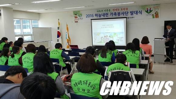 인제군자원봉사센터는 지난 16일 인제군 하늘내린센터에서 2016년 하늘내린 가족봉사단 발대식을 가졌다. 총 41개 가족으로 구성된 가족 봉사단은 올 연말까지 매달 1회 이상 재가 봉사 등 다양한 봉사활동을 전개하게 된다. 한편 봉사단 회원 100여명은 발대식 자리에서 가족 봉사활동 선서, 가족 소개, 팀 구성을 마치고 봉사활동을 위한 기초교육을 받았다.