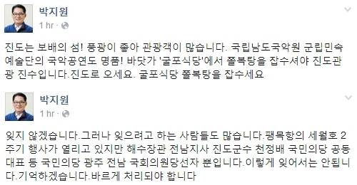 박지원 의원은 지난 16일 오전 자신의 트위터와 페이스북에 “진도는 보배의 섬! 풍광이 좋아 관광객이 많습니다. 국립남도국악원 군립민속예술단의 국악 공연도 명품! 바닷가 'OO식당'에서 쫄복탕을 잡수셔야 진도관광 진수입니다. 진도로 오세요. OO식당 쫄복탕을 잡수세요”라는 글을 남겼다.