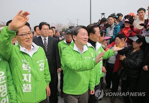 ▲박지원 국민의당 의원(맨 왼쪽)과 안철수 공동대표가 지난 2일 전남 목포시 평화광장 인근에서 시민들에게 지지를 호소하고 있다. 박 의원은 이번 총선에서 호남 맹주로서의 위상을 과시했지만 지역주의 언행으로 논란을 빚기도 했다. (사진=연합뉴스)