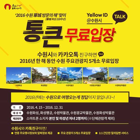 수원시는 범국민 메신저인 카카오톡으로 수원시와 친구를 맺으면 올 한 해동안 수원의 주요 관광지 5개소(수원화성, 화성행궁, 수원박물관, 광교박물관, 수원화성박물관)를 연중 무료로 입장하는 서비스를 진행 중으로 카카오톡 메시지를 통해 주요 행사소식 전달과 간단한 1:1 질의응답 서비스를 제공하고 있다.