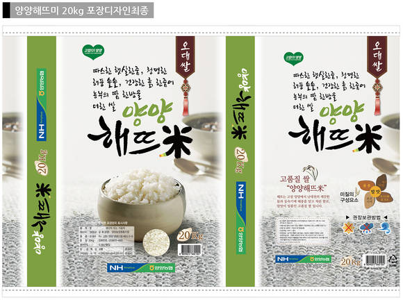 양양 해뜨미 포장재는 따스한 햇살 한 줌, 청명한 해풍 솔솔, 건강한 흙 한 줌에 농부의 땀 한 방울 더한 쌀이라는 카피를 넣어 청정한 이미지를 강조했다.