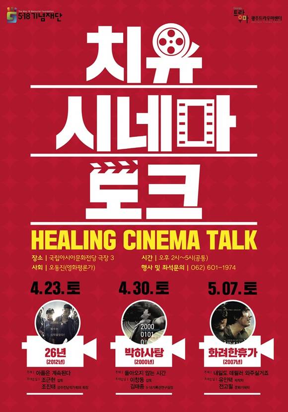 오는 23일에는 ‘아픔은 계속된다’를 주제로 영화 ‘26년’의 조근현 감독과 조진태 광주전남작가회의 회장이, 30일에는 ‘돌아오지 않는 시간’을 주제로 ‘박하사탕’의 이창동 감독과 김태종 5·18기록관 연구실장이, 5월7일에는 ‘내일도 데릴러 와주실 거죠’를 주제로 ‘화려한 휴가’의 유인택 제작자와 전고필 문화기획자가 ‘치유 시네마 토크’를 이어가며, 사회는 오동진 영화평론가가 맡는다.