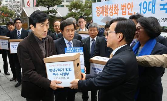 ▲전경련을 비롯한 경제단체 대표들이 지난 2월 22일 서울 여의도 더불어민주당 당사 입구에서 당 관계자들에게 ‘경제활성화 법안 입법 촉구 서명부’를 전달하고 있다. 어버이연합이 전경련의 뒷돈을 받고 동원됐다는 의혹이 제기되면서 서명운동 자체의 도덕성이 훼손되고 있다. (사진=연합뉴스)