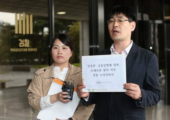▲김삼수 경제정의실천시민연합(경실련) 정치·사법팀장이 전경련이 어버이연합에게 거액을 지원하는 과정에서 차명계좌를 사용한 점 등을 들어 21일 전경련을 금융실명제 위반·조세포탈 혐의로 검찰에 고발하고 있다. (사진=연합뉴스)
