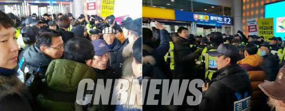 ▲어버이연합은 매사에 친기업적 태도를 취하면 노조 집해를 방해해 왔다는 점에서 전경련이 어버이연합의 배후로 지목되고 있다. 지난 2월 5일 서울역에서 설연휴 귀향객을 대상으로 세월호 진상규명 촉구 서명을 벌이고 있던 민주노총 회원들과 충돌한 어버이연합 회원들. (사진=4.16연대)