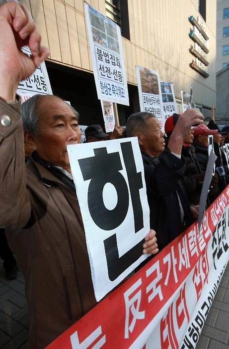 ▲지난해 12월 9일 한상균 민주노총 위원장이 피신한 서울 종로구 조계사 앞에서 어버이연합이 한 위원장을 즉각 체포할 것을 촉구하고 있다. 이들은 기업 편에서 노조를 압박하는 각종 집회에 여러차례 동원돼 온 것으로 알려졌다. (사진=연합뉴스)