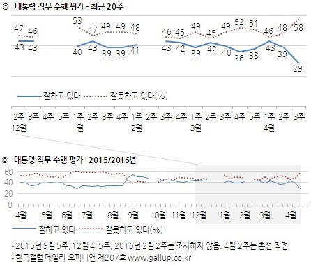 여론조사 전문기관인 <한국갤럽>19~21일 사흘간 전국 성인 14명에게 박 대통령의 대통령 직무수행도를 조사한 결과 긍정평가는 총선 직전인 전주(11~12) 조사 때보다 무려 10%p나 폭락한 29%로 조사됐다고 발표했다.