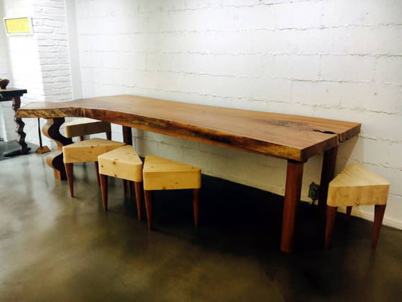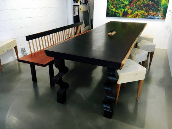 '웬지'와 '느티나무' 작품이 이번 전시의 주요 작품이다. '웬지'의 경우 상판은 자연목 그대로의 목리를 표현하고, 다리는 물결 무늬를 표현하는 데 주력했다.