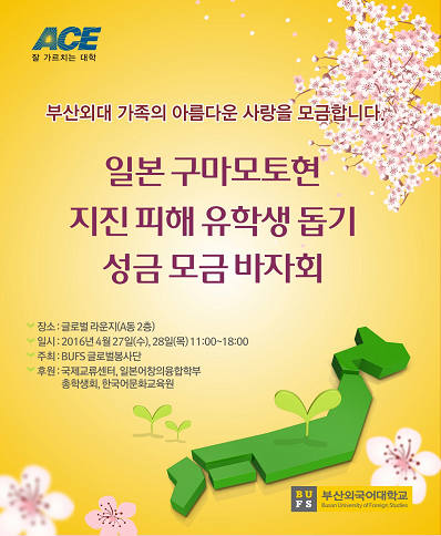 부산외대 글로벌 봉사단은 오는 27일부터 이틀간 오전 11시부터 오후 6시까지 일본 구마모토현 지진피해 유학생 돕기 성금 모금 및 바자회를 연다고 26일 밝혔다.