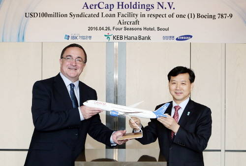 KEB하나은행은 27일 항공기 임대시장 세계 1위 업체인 에어캡(AerCap)과 국내에서 1억달러의 대규모로 진행한 항공기금융을 단독 주선하는데 성공하고 업무체결식을 가졌다고 밝혔다.