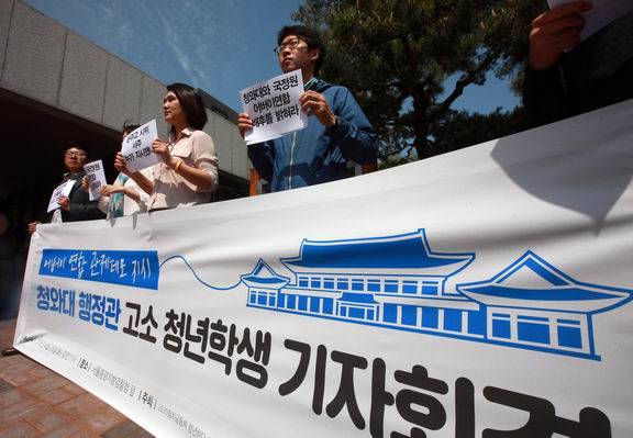 ▲어버이연합 추선희 사무총장이 집회 지시 문자메시지를 보낸 사람으로 청와대 허현준 선임행정관을 콕 집어 거명하면서 논란이 커지고 있다. ‘2030정치공동체 청년하다’ 등 청년단체들이 지난 26일 서울 서초동 서울중앙지검 앞에서 허현준 행정관을 상대로 고발장을 제출하기에 앞서 기자회견을 열고 있다. (사진=연합뉴스)
