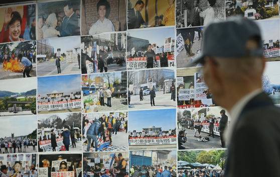 ▲어버이연합 사무실 벽면 가득 붙어 있는 박근혜 대통령 관련 사진과 집회 사진들. (사진=연합뉴스)