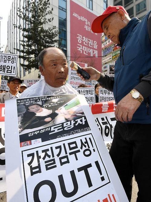 ▲‘어버이연합 스캔들’은 탈북단체들이 비박계 김무성 전 새누리당 대표 등을 공격하는 과정에서 내분이 발생해 세상에 알려지게 됐다. 지난달 25일 여의도 새누리당사 앞에서 어버이연합 회원들이 김무성 당시 대표를 규탄하며 삭발 시위를 벌이고 있다. (사진=연합뉴스)