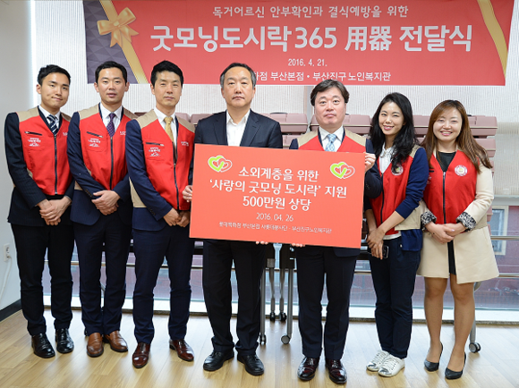 롯데백화점 부산본점(송정호 점장) 샤롯데 봉사단은 지난 26일 부산진구노인복지관을 방문해 500만원 상당의 '사랑의 굿모닝 도시락' 지원 사업 기금을 전달했다. (사진제공=롯데백화점 부산본점)