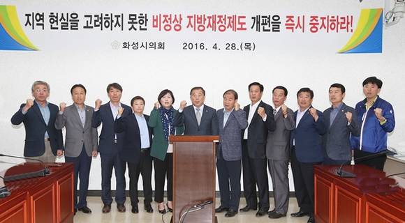 한편 화성시의회도 지방재정제도 개편 움직임에 대해 28일 의회 대회의실에서 박종선 의장을 비롯한 의원 18명이 참석한 가운데 성명서를 발표하고 "행정자치부가 발표한 내용은 지자체의 각기 사정을 고려하지 않고 지자체간 재정 격차를 줄이기 위해 부자 지자체의 돈을 끌어다 가난한 지자체를 지원한다"는 것으로 "지자체간 빈익빈 부익부는 개선되지만 지자체 재정에 지나친 간섭으로 지방자치의 본질 및 독립성을 훼손할 수 있는 것"이라고 강하게 비판했다.