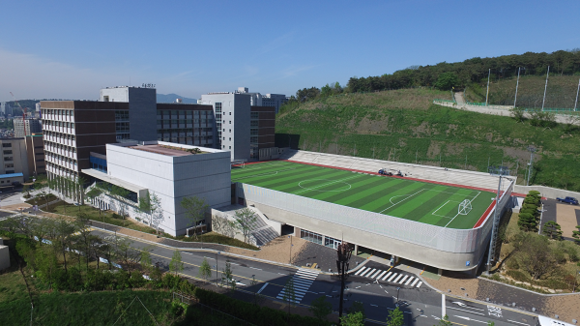 이외 지상 2층 규모의 주차장은 건축연면적 1만5436㎡(약 4760평)로 501대의 차량을 주차할 수 있으며, 주차장 옥상은 중대형 인조잔디 축구장과 각종 체육행사를 위한 스탠드(1600여석)를 설치해 우수하고 다양한 기능의 교육 환경을 조성했다.