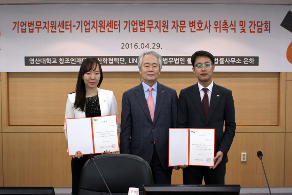 영산대 LINC사업단(단장 이운용)은 29일 오후 양산캠퍼스 천성학관 대회의실에서 가족회사를 대상으로 실질적이고 체계적인 법무지원을 하기 위해, 졸업생 변호사와의 법률자문 계약을 체결하고, 자문변호사 위촉식을 진행했다고 2일 밝혔다.