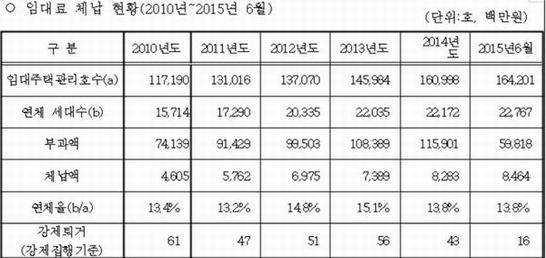 지난해 10월 국정감사 때 국토교통위원회 소속 이찬열 의원(더불어민주당)이 서울시로부터 받은 자료에 따르면, 지난해 6월 기준 SH공사 임대주택의 체납가구는 전체 16만 4201호 중 2만 2767가구(13.8%)며 체납액은 84억 6400만원에 이르렀다. 임대료 연체 가구 수는 2010년 1만 5714가구에서 2011년 1만 7290가구, 2012년 2만 335가구, 2013년 2만 2035가구, 2014년 2만 2172가구로 매년 늘고 있는 추세다.