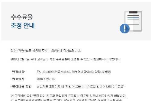 신한카드는 지난 2월부터 현금서비스와 리볼빙 최고금리를 각각 0.44%포인트, 0.04%포인트 인하했다. 카드론과 할부수수료 연체이자율은 변동이 없었다.