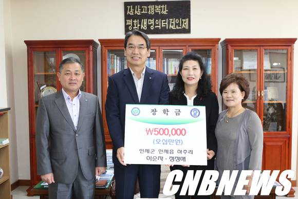 인제군 인제읍 하추리에 거주하는 이순자(사진 오른쪽 두 번째), 정정애(사진 맨오른쪽)씨가 11일 인제군청을 방문해 제18회 인제 용대리 황태축제 황태요리 경연대회에서 은상을 수상해 받은 상금 50만원을 지역인재 육성을 위해 써 달라며 장학금으로 기탁했다.