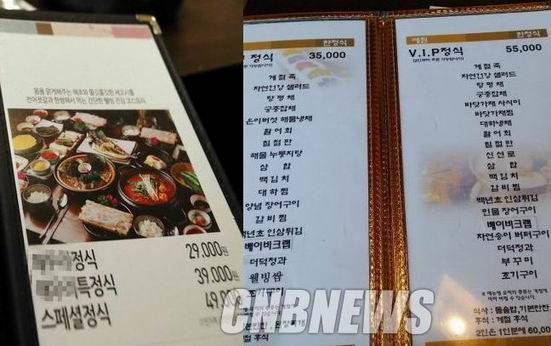 ▲서울시내 음식점 두 곳의 한정식 세트 메뉴판. 김영란법의 음식비 제한선인 3만원 이하를 찾아보기 힘들다. 나눠서 결제하는 쪼개기 접대가 횡행할 가능성이 높다. (사진=CNB포토뱅크)