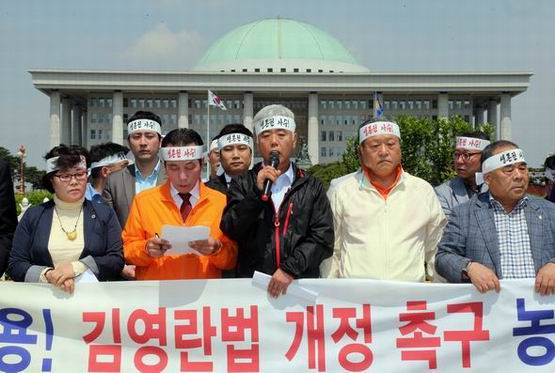 ▲한국농축산연합회 등 농축산 단체 회원들이 지난 12일 서울 여의도 국회 정문 앞에서 “김영란법으로 농축산물 선물 세트의 판매가 감소할 수 있다”며 법 개정을 촉구하고 있다. 하지만 김영란법이 선물 횟수에 제한을 두지 않고 있어 제한선인 5만원을 넘기지 않는 범위에서 여러 차례에 걸쳐 선물을 보낼 경우 제재할 방법이 없다. (사진=연합뉴스)