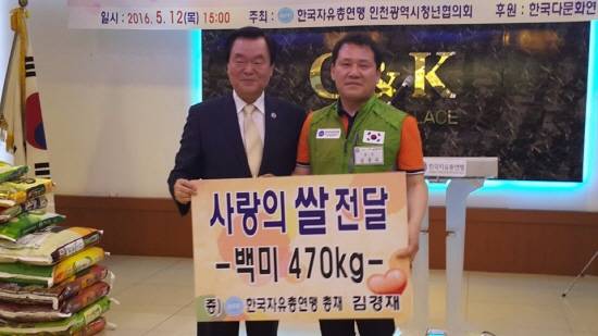 한국자유총연맹은 김경재 중앙회장이 지난 12일 인천 C&K 웨딩홀에서 개최된 ‘통일선봉대 인천청년카페 1호점, 일일카페 아름다운 동행’에 참석해 북한이탈주민들에게 쌀화환을 전달했다고 13일 밝혔다.