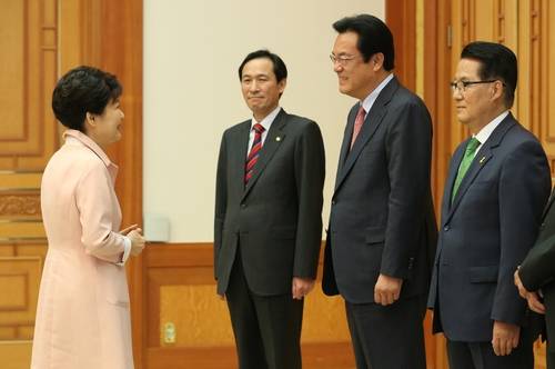 그리고 박 대통령은 국민의당 박 원내대표에게는 "세 번째로 원내대표 맡으신 거죠? 헌정사상 처음 있는 일이라고"라면서 "그래서 이런 정책을 풀어 가시는데 거의 달인같이 잘 해주실 것라고 생각한다. 그동안 쌓으신 경험도 많고 경륜도 풍부하시니까 여러가지 어려운 일들을 잘 풀어서 정말 일하는 국회로, 국민들이 바라는 국회로 이끌어 가는 데 힘써 주시길 바란다"고 협조를 요청했다.